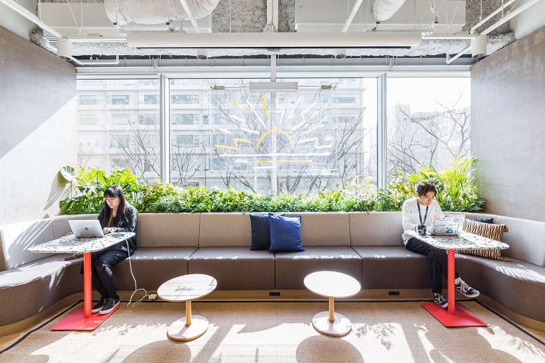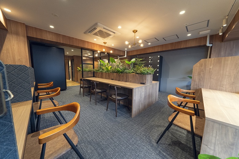 オフィスは新宿御苑の自然と調和する、木材を基調にした柔らかな色合いのデザインのスーツでもTシャツでも馴染む、落ち着きと安心感がある拠点です。広々した開放的なラウンジスペースは混雑を感じさせず、集中して作業したい方にもおすすめです。