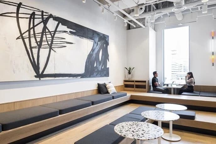メインエントランスのゲートを通ると遮るものもあまりなく、開放的で大きな共用ラウンジが広がっております。特に窓際にある掘りごたつ式のデスクは一番の人気席です。