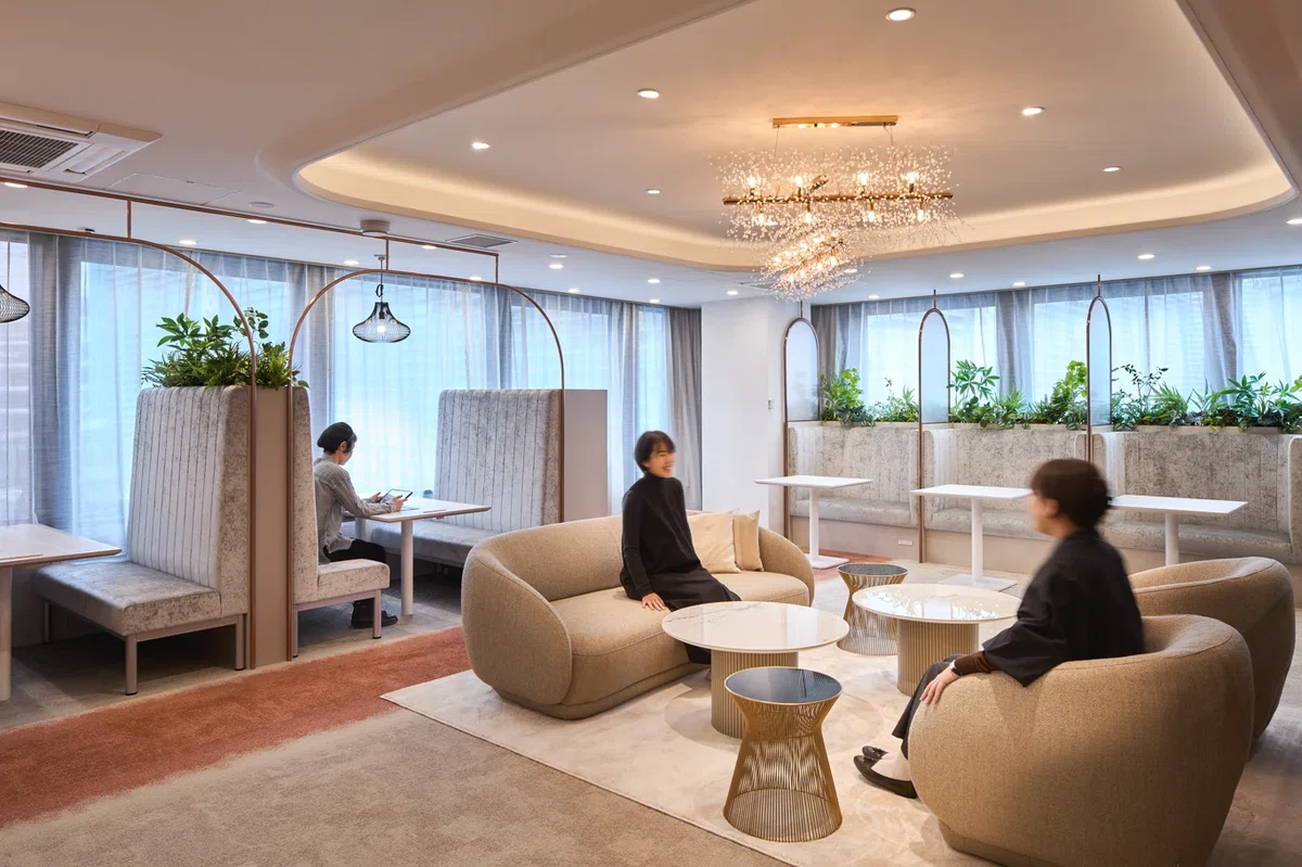 柔らかなベージュ色を基調に、横浜らしい港の爽やかな青が取り入れられて、モダンラグジュアリーなホテルのような落ち着いた空間で作業することが可能です。